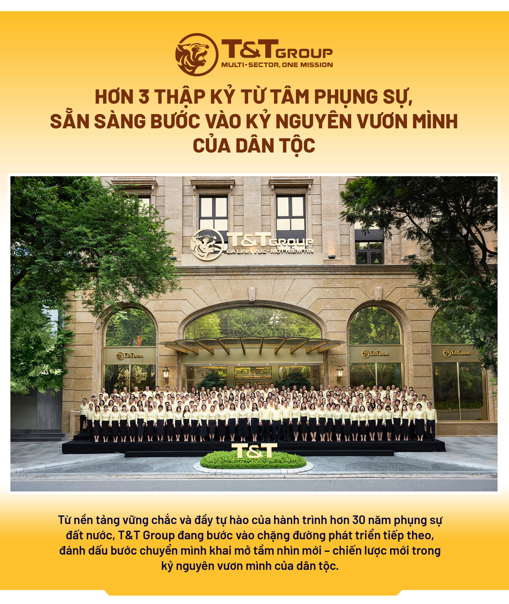 Từ nền tảng vững chắc và đầy tự hào của hành trình hơn 30 năm phụng sự đất nước, T&T Group đang bước vào chặng đường phát triển tiếp theo, đánh dấu bước chuyển mình khai mở tầm nhìn mới – chiến lược mới trong kỷ nguyên vươn mình của dân tộc.